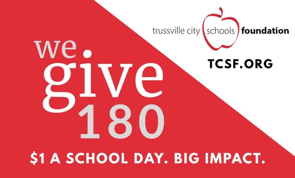 Give 180 is a Trussville City Schools Foundation (TCSF) annual fundraising initiative inviting families and businesses to support our schools by giving just $15 a month—less than most streaming subscriptions—or $180 for the year. Every dollar goes directly to Trussville City Schools to fund impactful school based projects, teacher grants, and opportunities for students and teachers. Families and businesses who join will receive a yard sign to proudly show their support for our schools and community.